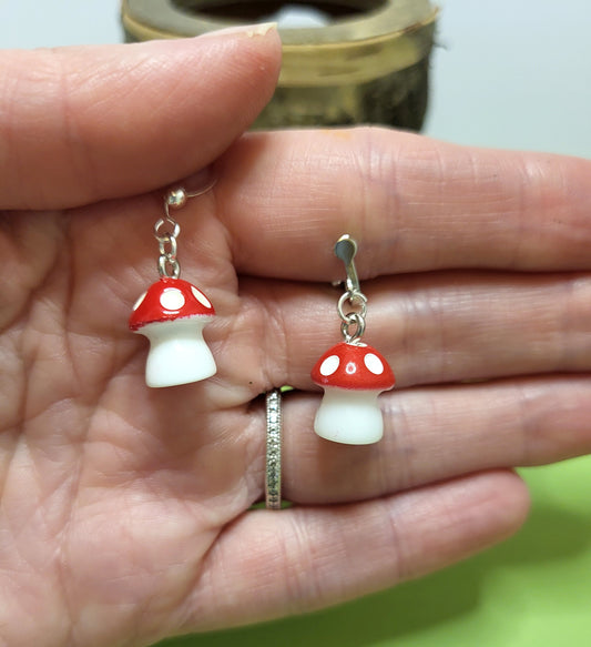 Cute Little Toadstool Earrings. Autumn Mushroom Earrings. Nickel Free Wires or Clip On