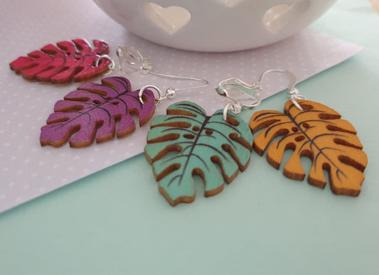 Wooden Monstera Leaf Earrings. Cheese Plant, Clip on, Hypoallergenic, Allergy, Lead, Nickel Free. Summer, Gift For Her