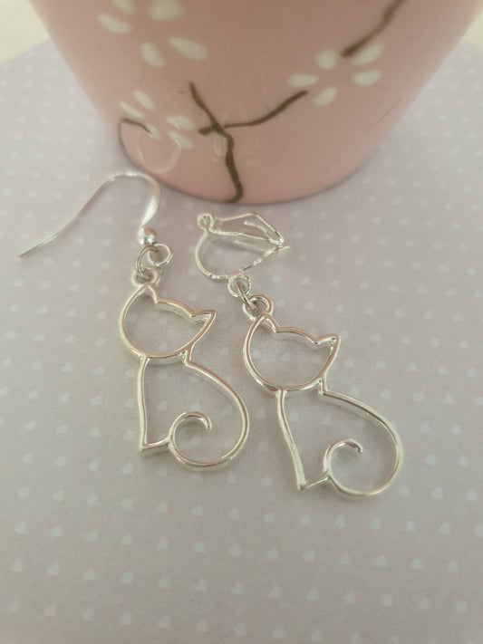 Outline Cat Earrings in Silver with Allergy Free, Nickel Free, Hypoallergenic Wires, or Clip On Earrings