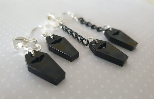 Bat Coffin Small Drop Dangle Earrings Halloween Spooky Clip Ons, Hypoallergenic Allergy Nickel Lead Free Stocking Filler