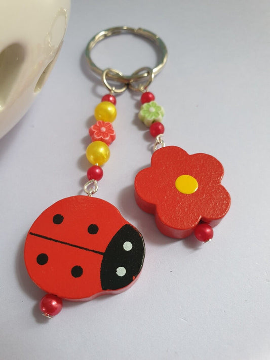 Red Ladybird Ladybug and Flower Keyring Keychain. Wooden Gardeners Gift