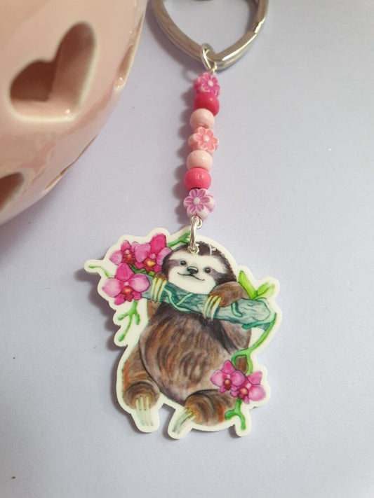 Sloth and Beads Keyring Keychain. Sloth Lover Gift. Pink Flowers