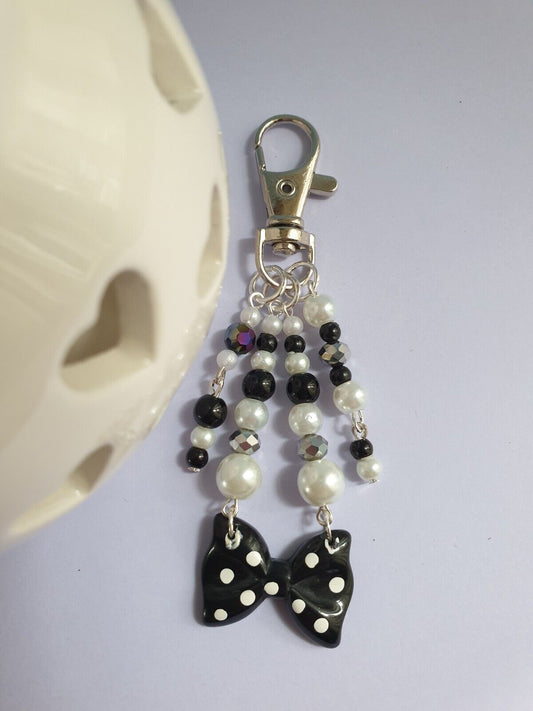 Black and White Polka Dot Keyring Keychain. Monochrome. Gift for Her. Bow Bag