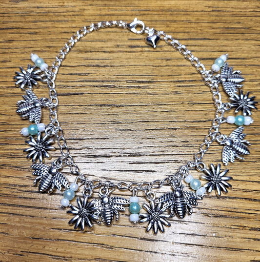 Bee and Flower Silver Tone Charm Bracelet with Bead Detail. One of a Kind