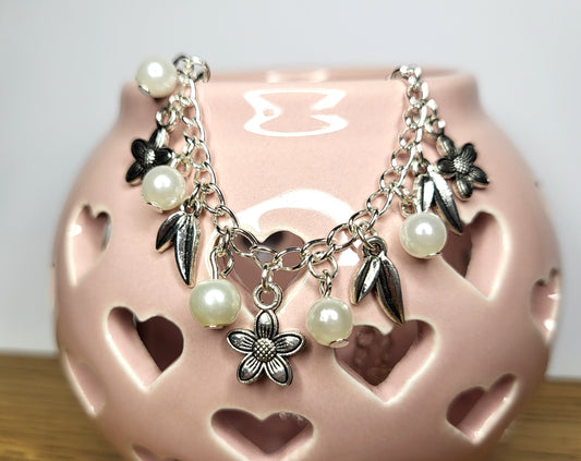 Floral Silver Tone Charm Bracelet with Faux Pearl Detail. One of a Kind. Flowers