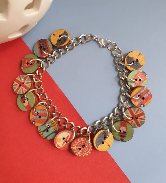 London Themed Button Charm Bracelet. Adjustable Bracelet. England.