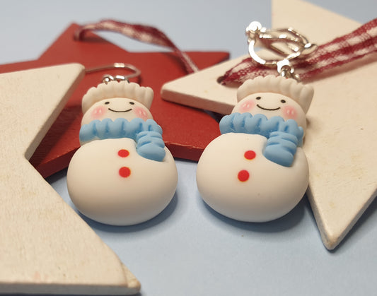 Cute Snowmen Earrings with Blue Scarf. Nickel Free Wires or Clip Ons