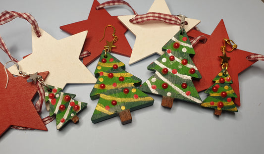 Handpainted Statement Wooden Christmas Tree Earrings. Nickel Free Wires or Clip Ons