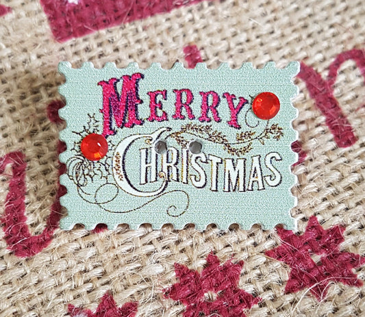 Wooden Postage Stamp Style Christmas Brooch with Rhinestones. Santa, Tree, Xmas, Holly, Candle, Sleigh, Snowflakes Stocking Filler