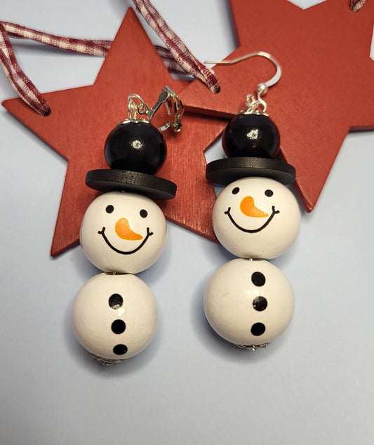 Wooden Beaded Snowman Earrings. Christmas Jewellery. Nickel Free Wires or Clip On