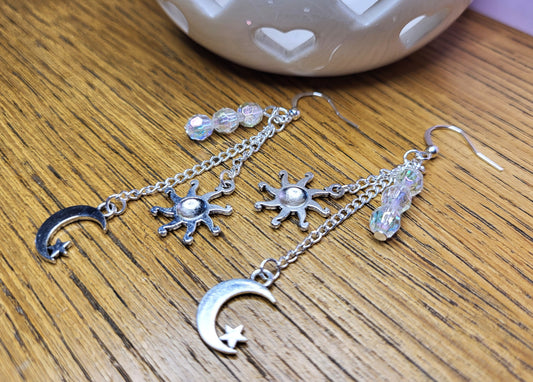 Silver Tone Sun and Moon Multistrand Earrings. One of a Kind. Nickel Free Wires or Clip On