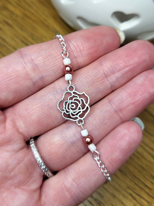 Silver Tone Rose Earrings and Bracelet Set with Bead Detail. Nickel Free Wires or Clip On. One of a Kind