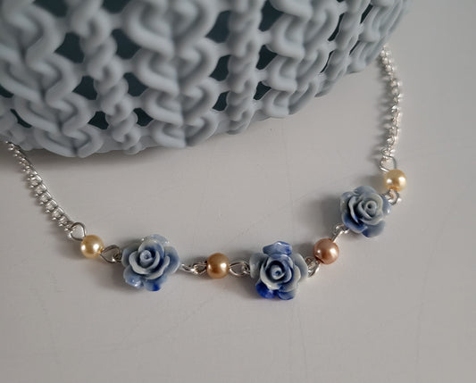 Blue Rose and Faux Pearl Earring and Necklace Set. One of a Kind
