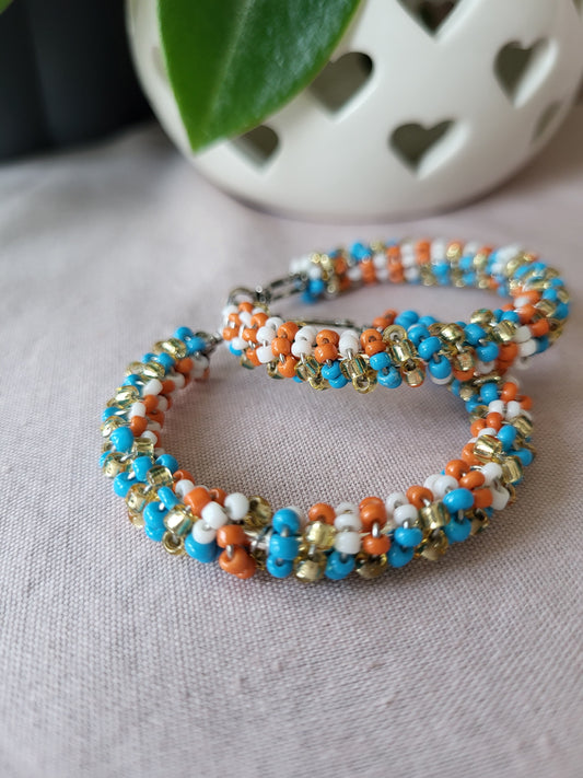 White,Turquoise, Orange and Gold Beaded Hoop Earrings. Upcycled