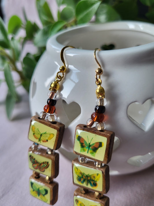 Upcycled Wooden Butterfly Statement Earrings with Bead Detail. Nickel Free Wires or Clip On