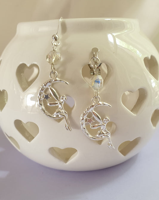 Fairy on Moon Silver Tone Earrings. Hypoallergenic, Nickel Free or Clip Ons. Spiritual Earrings. Luna Earrings