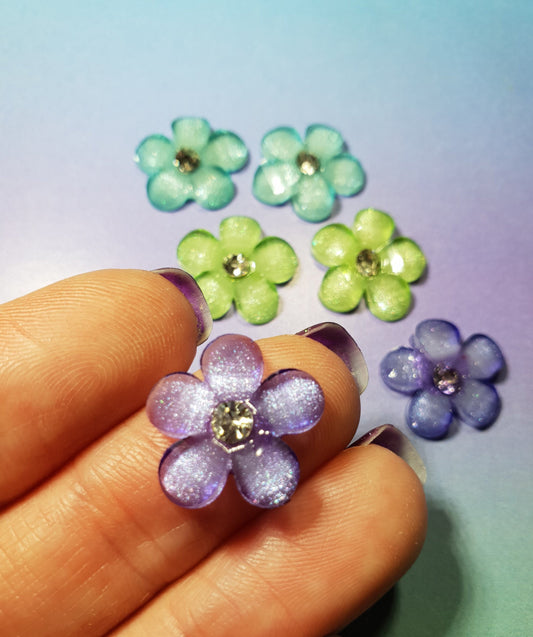 Pretty Flower Stud Earrings with Sparkle. Green, Purple,Blue. Floral. Hypoallergenic, Allergy, Lead, Nickel Free. Mothers Day Gift