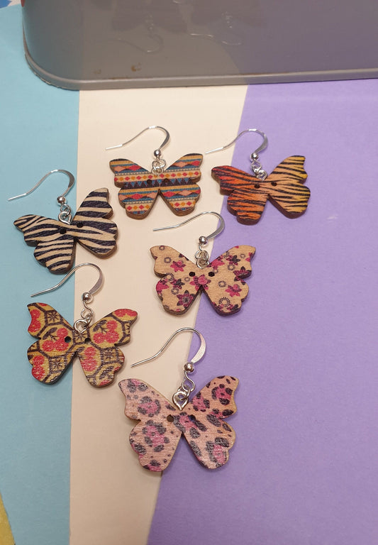 Patterned Wooden Butterfly Drop Earrings - Zebra Print, Tiger Print, Leopard Spots, Floral Hypoallergenic Lead Nickel Free, Mothers Day