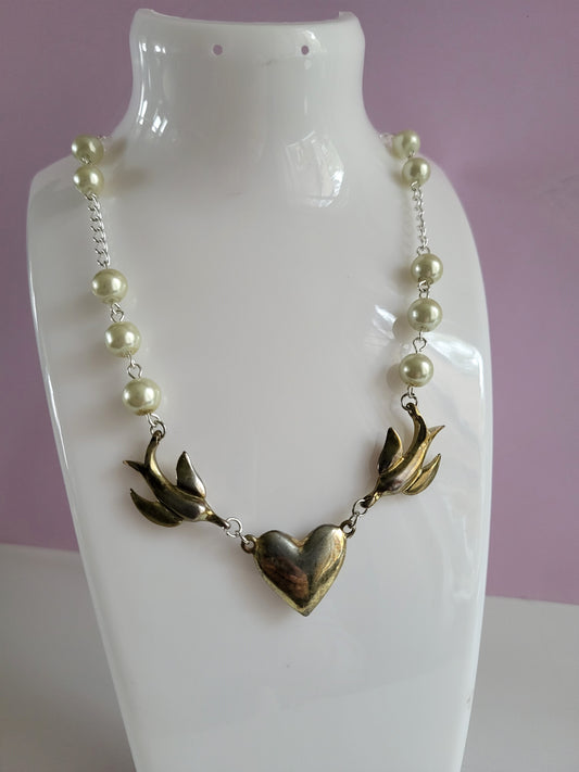Silver Tone Love Birds Necklace with Faux Pearl Detail. Recycled, Upcycled, One of a Kind
