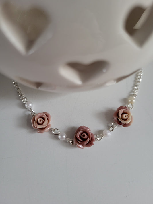 Pink Rose and Faux Pearl Earring and Necklace Set. One of a Kind