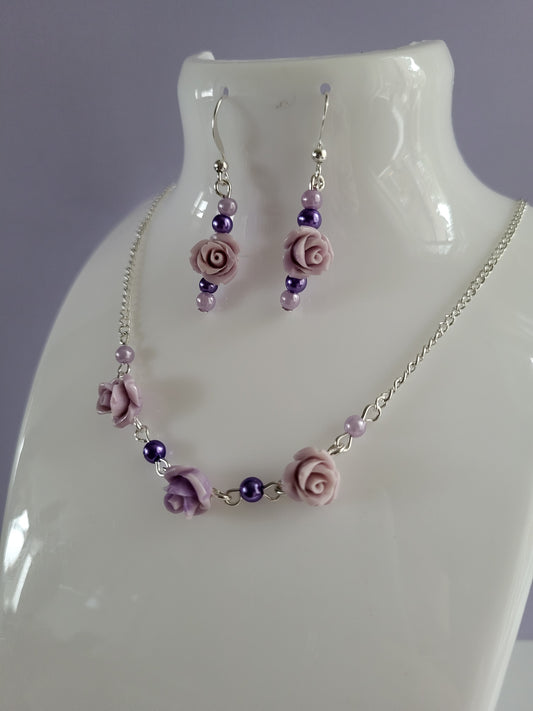 Lilac Rose and Faux Pearl Earring and Necklace Set. One of a Kind