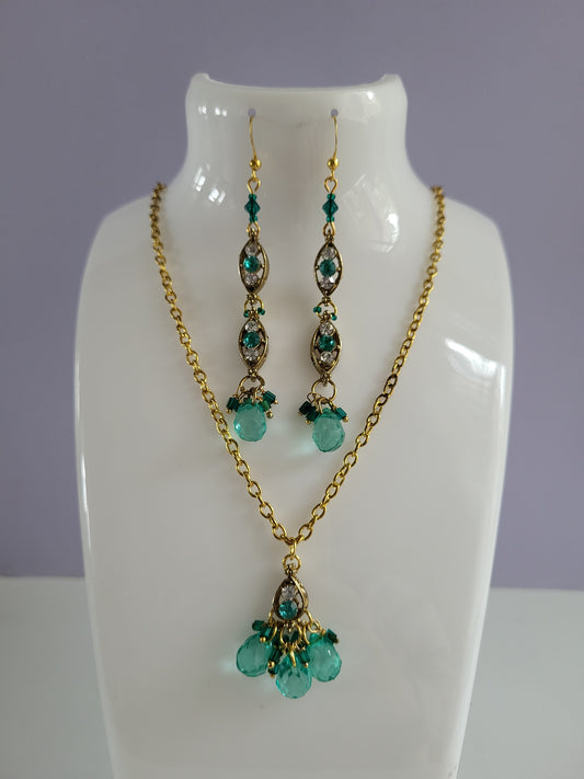 Gold Tone with Green Stones Earrings and Necklace Set. Upcycled, Recycled, One of a Kind