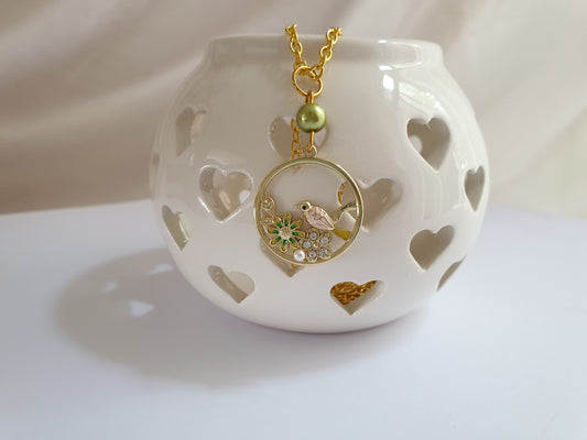 Gold Tone Bird and Flowers Circle Pendant Necklace. Bird Jewellery, Bird Jewelry