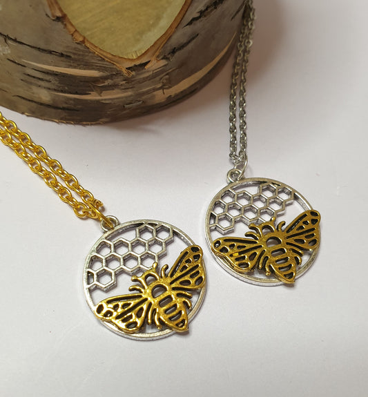 2 Tone Bee and Honeycomb Necklace with Gold or Silver Chain