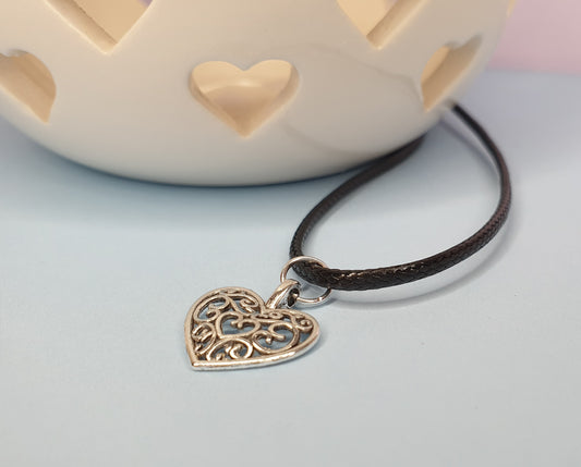 Filigree Heart Pendant on Black Cord Necklace. Silver Love Heart