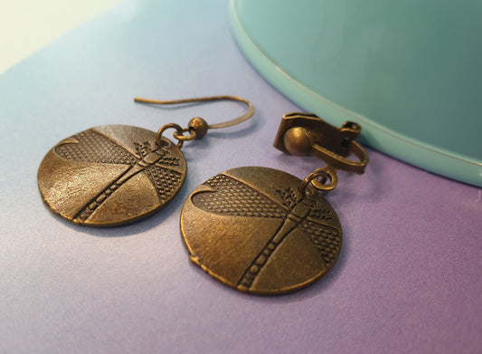 Bronze Dragonfly Circle Earrings and Necklace. Animals, Insect, Dragonflies, Clip On, Hypoallergenic, Allergy, Lead, Nickel Free. Mothers Day Gift