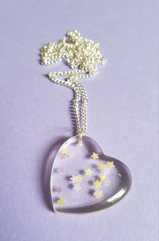 Heart and Stars Necklace Pendant and Chain. Pink and Clear Pretty, Glitter, CuteKawaii Kawaii Valentine's Day Gift
