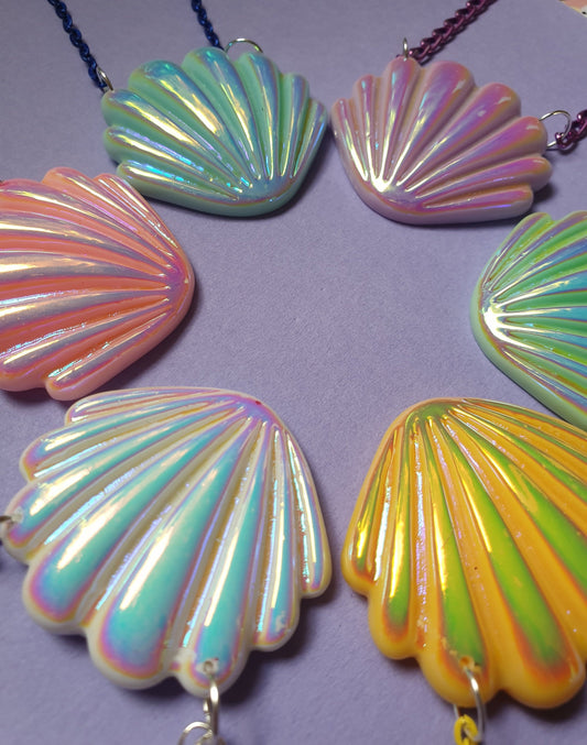 Sea Shell Bib Style Necklace with Iridescent Shine. Mermaid, Clam Shell, Pink, Purple, White, Yellow, Green, Blue, Gift