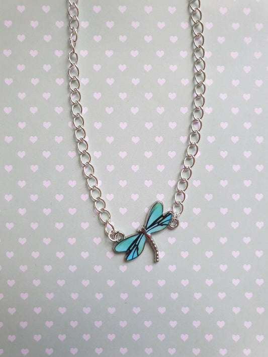 Pretty Dragonfly Bib Style Necklace. Silver with Coloured Wings.