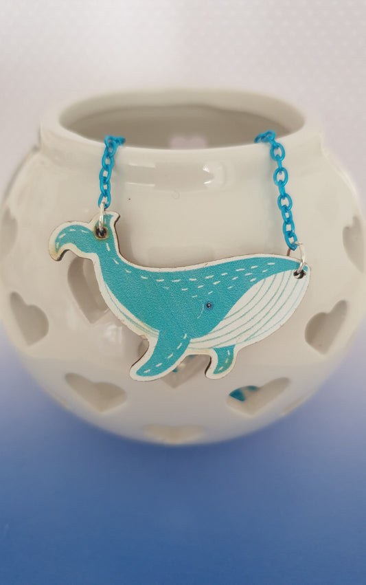 Wooden Whale Bib Style Necklace. Blue, Humpback, Ocean, Sea, Summer. Gift for Her