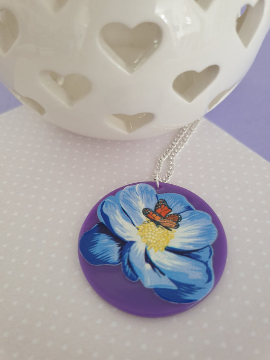 Circular Purple Floral Statement Necklace. Pendant and Chain. Butterfly. Mothers Day Gift. Stocking Filler