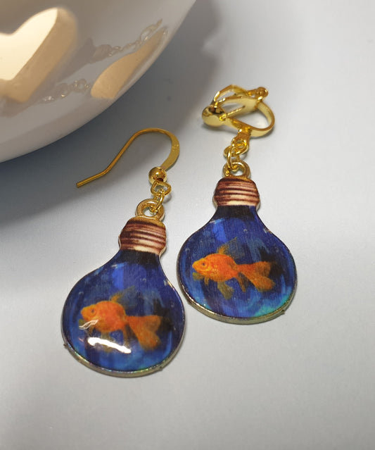 Goldfish Fish Lightbulb Earrings. Nickel Free Wires or Clip Ons