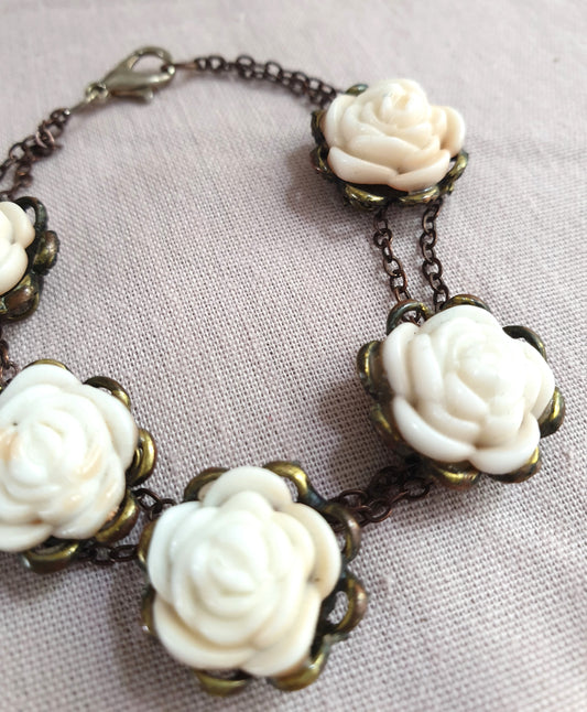 Bronze Tone White Roses Bracelet. Recycled Jewellery