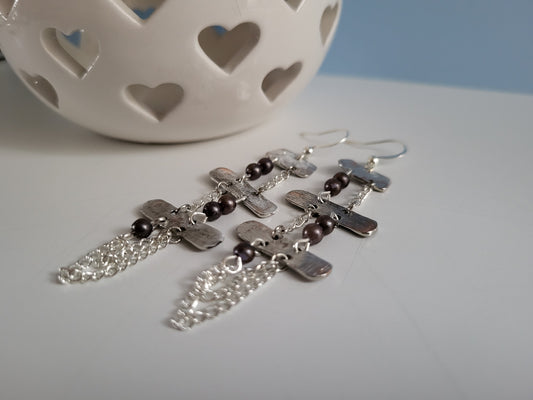 Silver Tone Strip Earrings with Dark Beads and Chain Detail. Recycled, Upcycled, One of a Kind