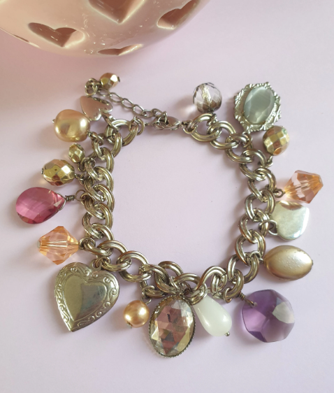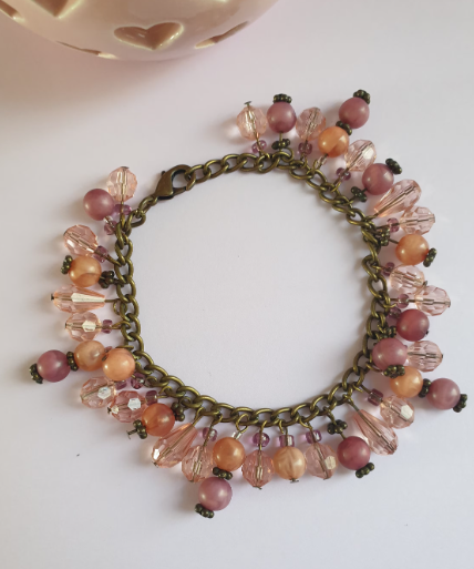 Pink and Bronze Beaded Charm Bracelet. Recycled Jewellery