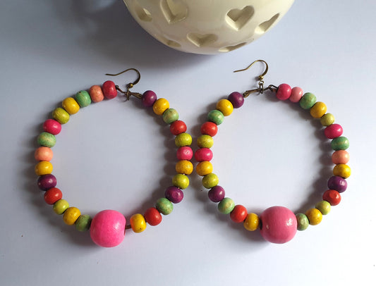 Recycled Multi Colour Wooden Beaded Hoop Earrings. Hypoallergenic, Nickel and Allergy Free
