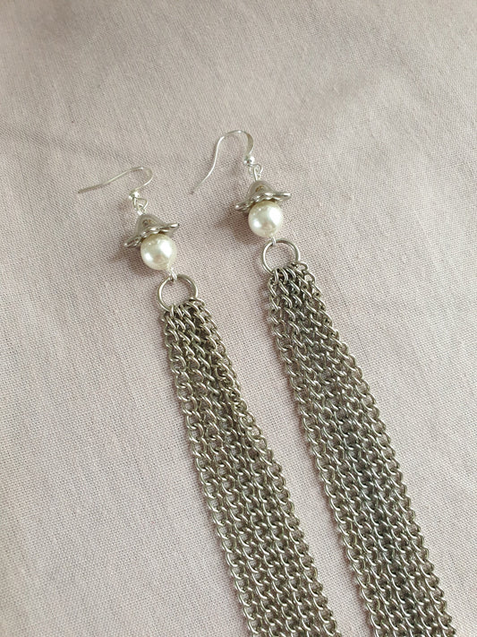Silver Tone and Faux Pearl Very Long Tassel Earrings. Upcycled Earrings. Hypoallergenic Earrings, Nickel Free Earrings