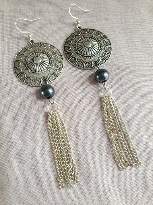 Silver Tone Circle Tassel Earrings with Bead Detail. Hypoallergenic, Allergy and Nickel Free. Upcycled Recycled Jewellery