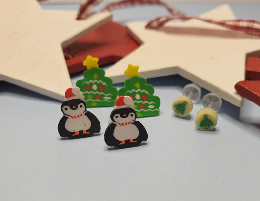 Christmas Stud Earrings. Nickel Free Posts. Christmas Tree and Penguin