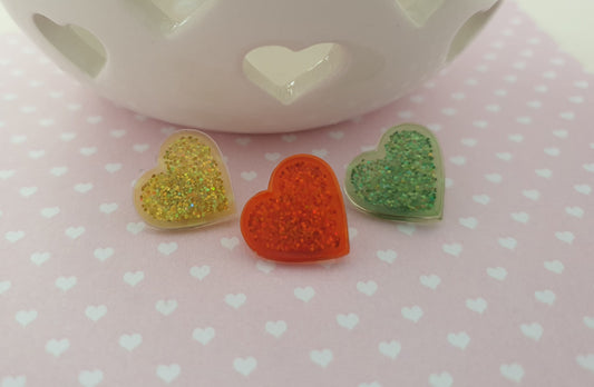 Glitter Heart Stud Earrings, Studs, Colourful, Bright Colours. Clip Ons, Hypoallergenic, Allergy, Lead, Nickel Free