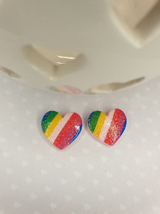 Rainbow Heart Stud Earrings with Glitter Detail. Love Heart. Pride. LGBTQ. Hypoallergenic, Allergy, Nickel Free. Clip On Earrings