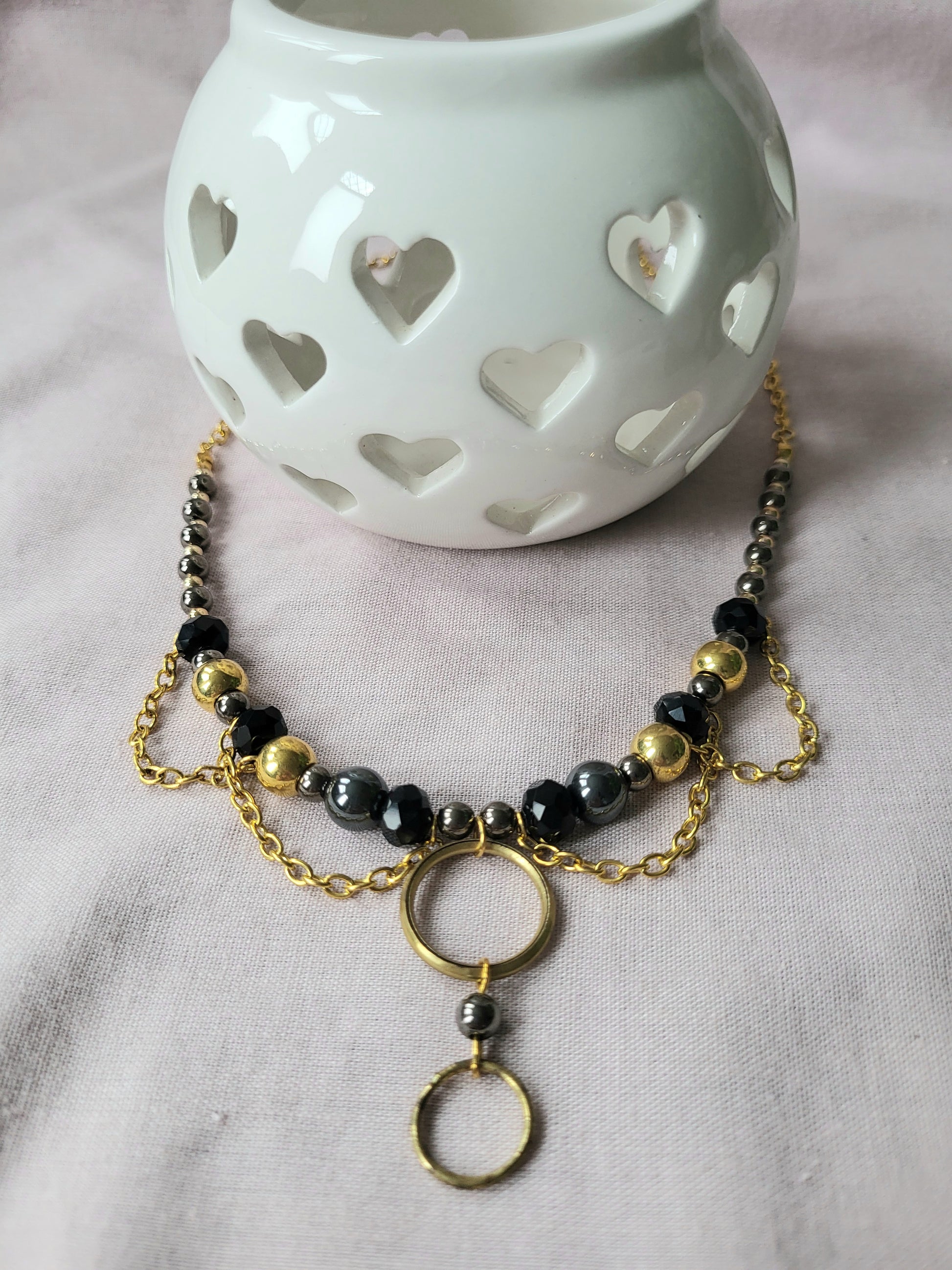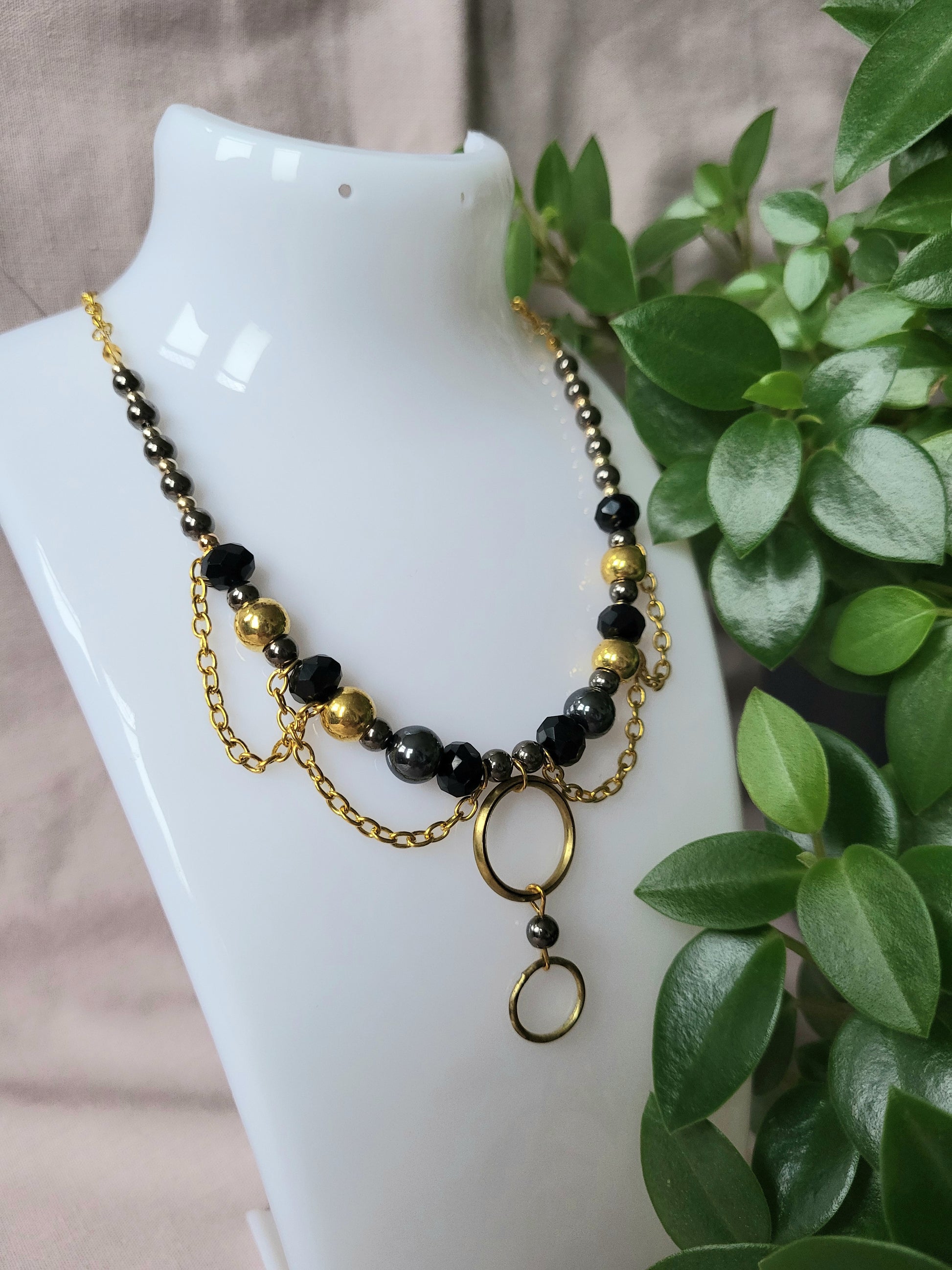 Black and Gold Upcycled Beaded Bib Necklace with Double Ring Drop Pendant and Chain Detail