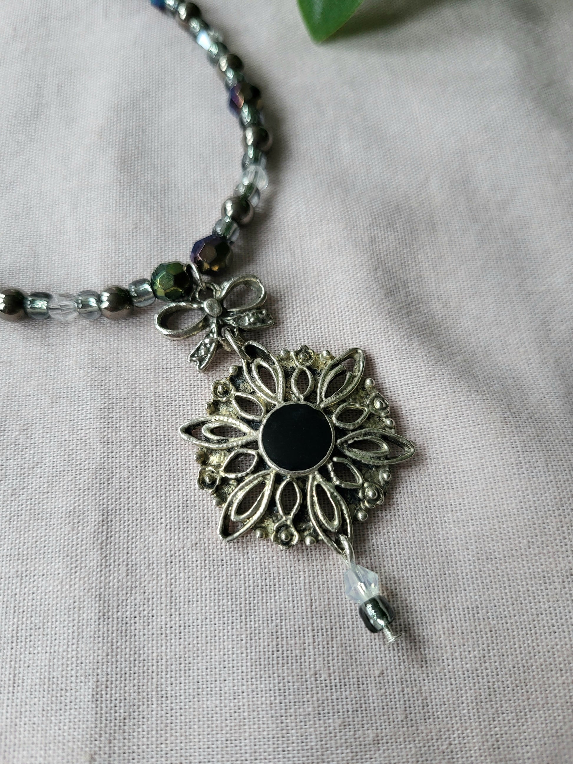 Black and Silver Upcycled Beaded Bib Necklace with Bow Detail