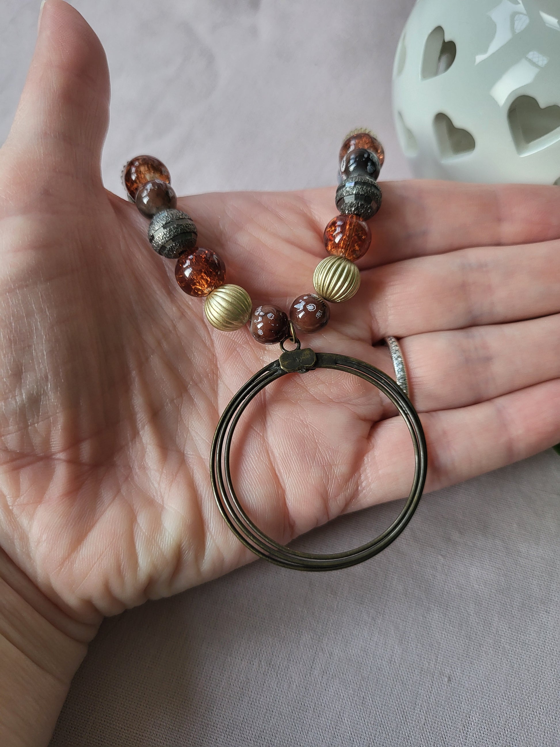 Brown and Gold Upcycled Statement Necklace with Circle Pendant. One of a Kind