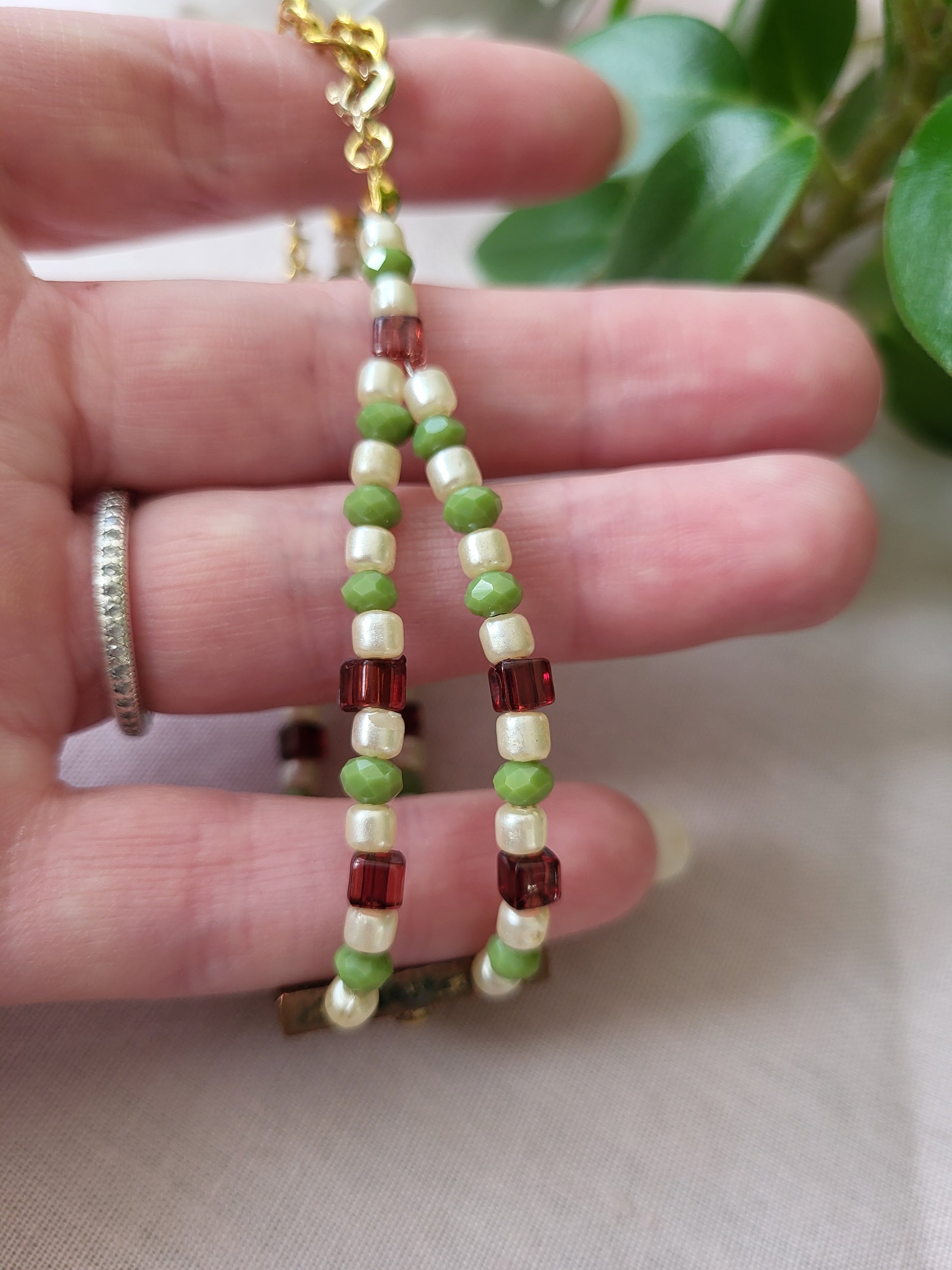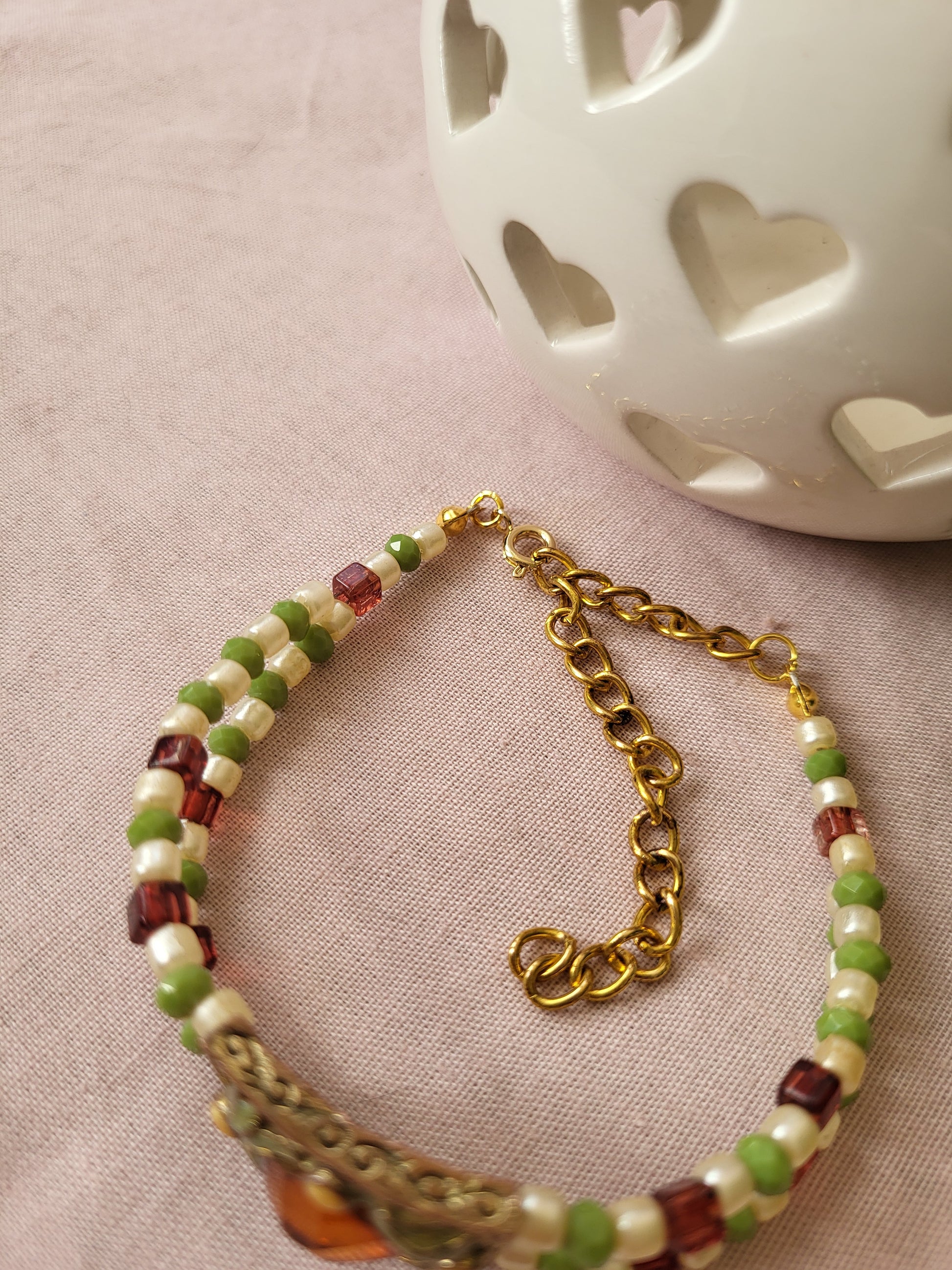 Upcycled Green, Ivory and Dark Red Beaded Bracelet with Ornate Pendant