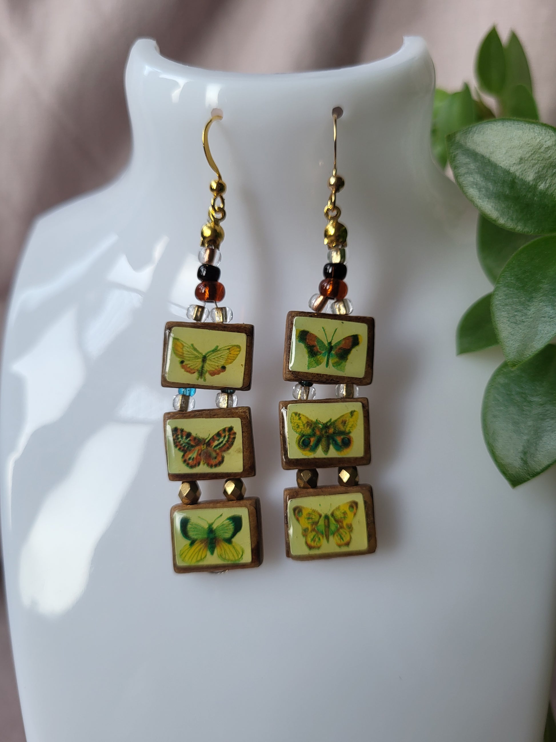 Upcycled Wooden Butterfly Statement Earrings with Bead Detail. Nickel Free Wires or Clip On